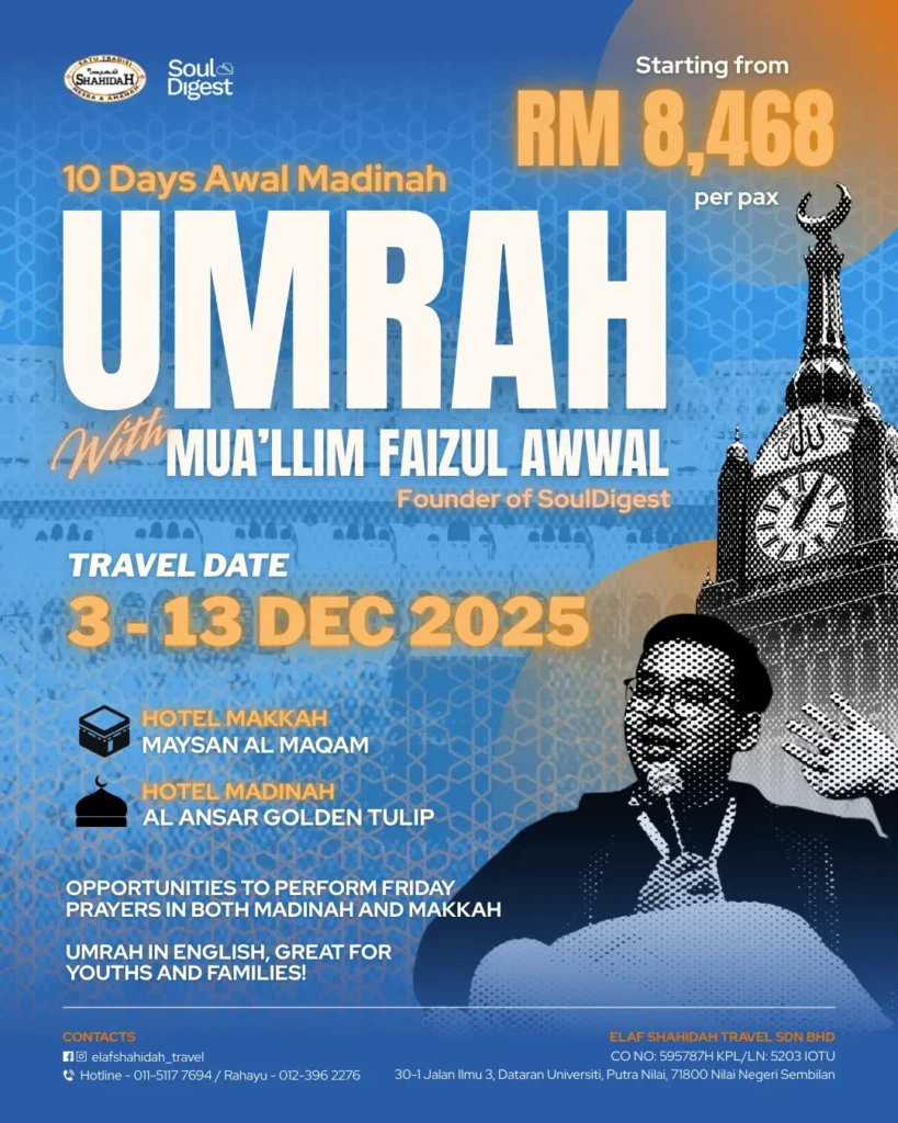 An interactive Umrah with Mu’allim Faizul Awwal — a journey to Makkah and Madinah enriched with sessions that bring the history and meaning of Umrah to life through engaging lessons and activities.